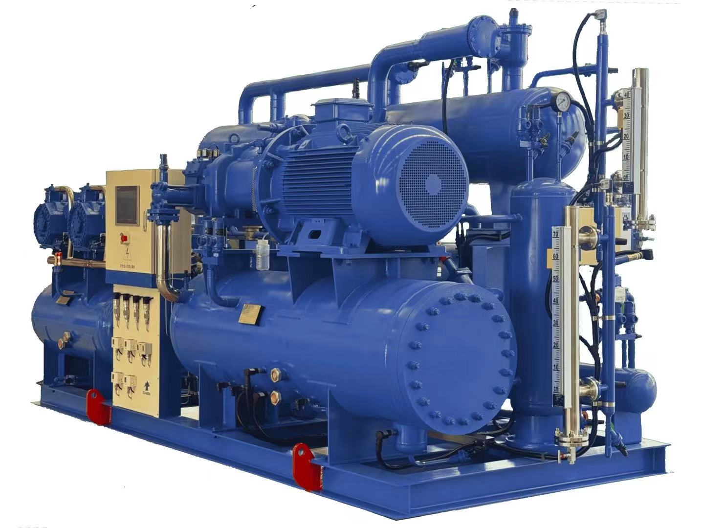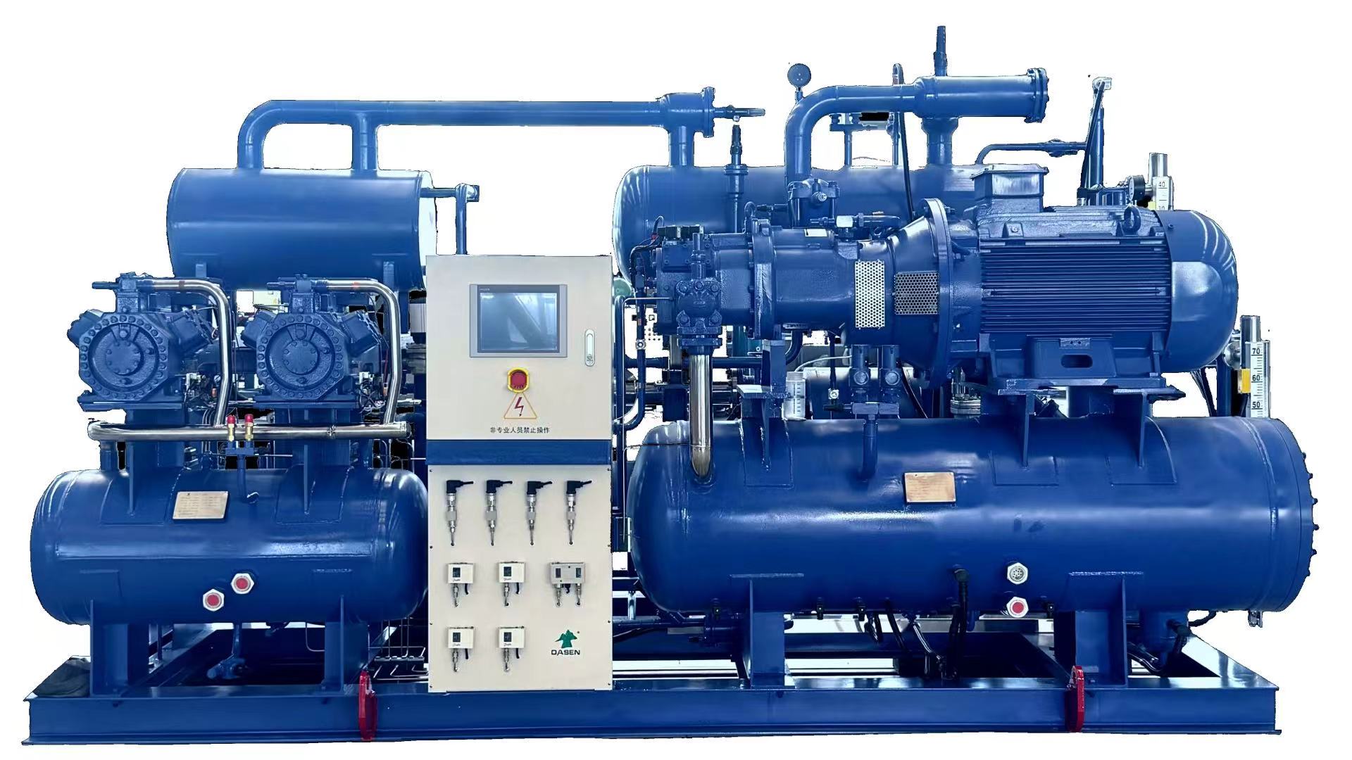 復疊撬塊適用于蒸發(fā)溫度在-50~-25℃之間的多種工況,在速凍工況下蒸發(fā)溫度更低,速凍效果更好,運行能耗略低于NH3的雙機雙級系統(tǒng),特別適合大中型速凍系統(tǒng)