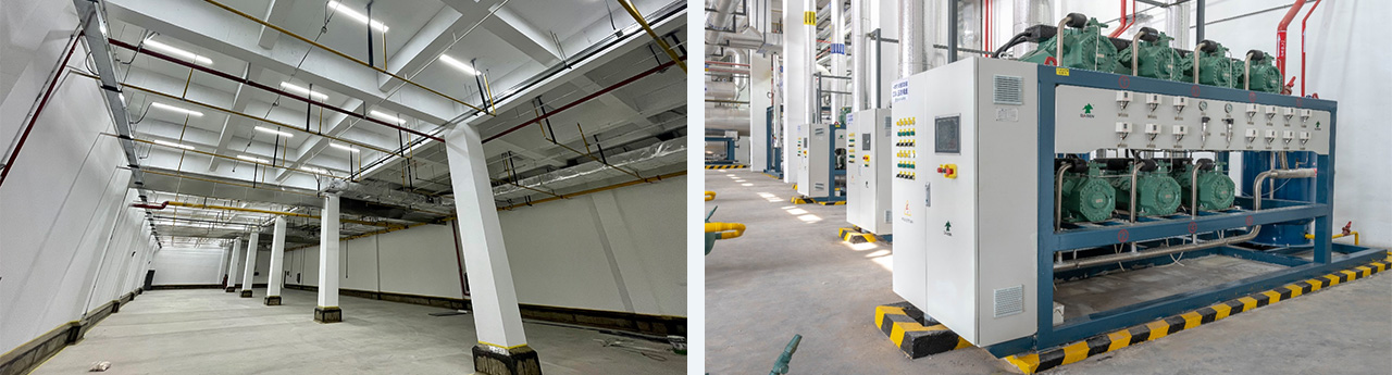 建筑面積17264㎡,層高4.2-18米,存儲(chǔ)噸位為6565噸,四臺(tái)速凍機(jī)配套冷源,采用氨/CO2復(fù)疊制冷,R507制冷,末端冷風(fēng)機(jī),水融霜加電化霜。位于山東省日照市,為綜合性食品加工項(xiàng)目,涵蓋速凍、冷藏、車(chē)間空調(diào)等生產(chǎn)各個(gè)環(huán)節(jié)工藝用冷。