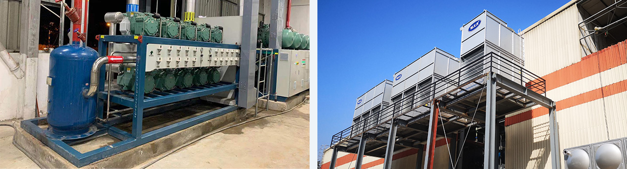一座一層鋼結(jié)構(gòu)冷庫(kù),冷庫(kù)面積約20000㎡,公稱容積158100m3,總庫(kù)容30020噸,凈高9.3m。共分9個(gè)冷間,其中部分冷間為高低溫兩用。低溫庫(kù)及變溫庫(kù)采用二氧化碳(R744)與氟利昂(R507)復(fù)疊制冷系統(tǒng) 變溫庫(kù)(高溫)采用CO2 載冷系統(tǒng),穿堂采用氟利昂(R507)制冷系統(tǒng) 。末端設(shè)備為吊頂式冷風(fēng)機(jī),低溫庫(kù)及變溫庫(kù)系統(tǒng)采用自動(dòng)水融霜,穿堂系統(tǒng)采用空氣化霜。