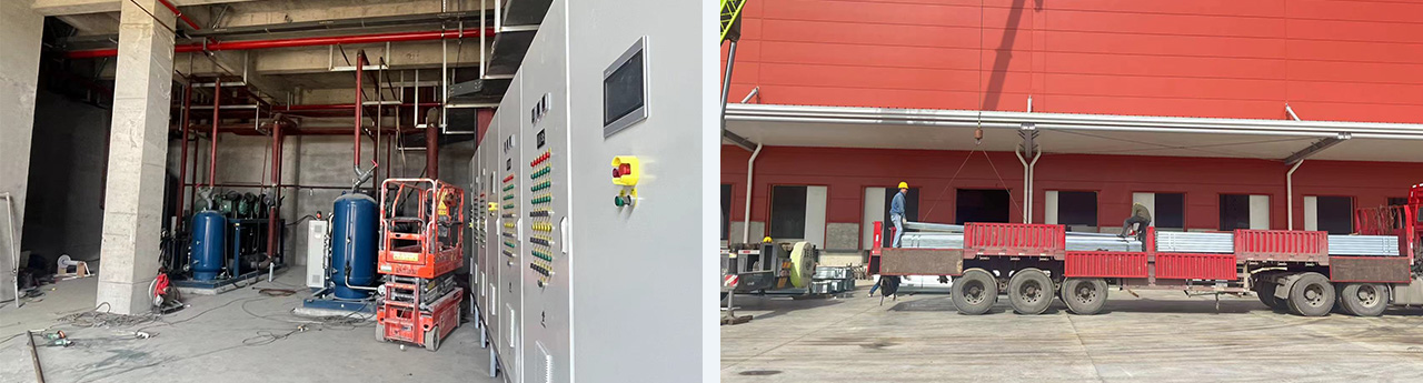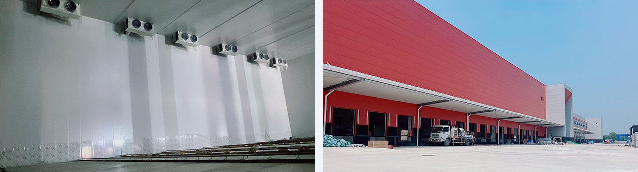 位于河北石家莊市,低溫兩間高溫兩間,總工程容積93600立方米,低溫存儲(chǔ)14000噸,高溫150噸。穿堂1070m2。采用的R507直膨制冷。末端采用冷風(fēng)機(jī),熱氣融霜。